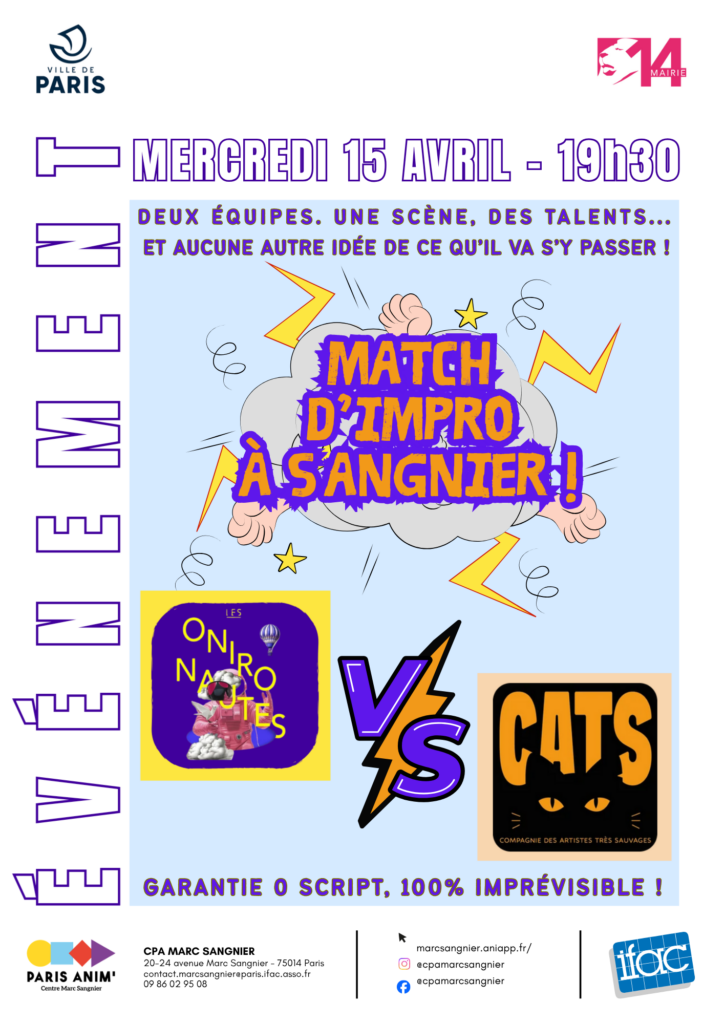 Les Onironautes et La Compagnie des Artistes Très Sauvages se retrouvent pour un face-à-face rythmé et imprévisible. Chaque équipe apporte son énergie, son style et sa manière de jouer. Leur objectif reste simple : surprendre le public et partager un moment vivant.