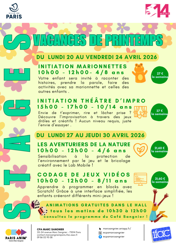 Pendant les vacances de printemps, le centre propose plusieurs stages pour enfants à Paris. Des activités variées, adaptées à différents âges, pour apprendre, créer et s’amuser.